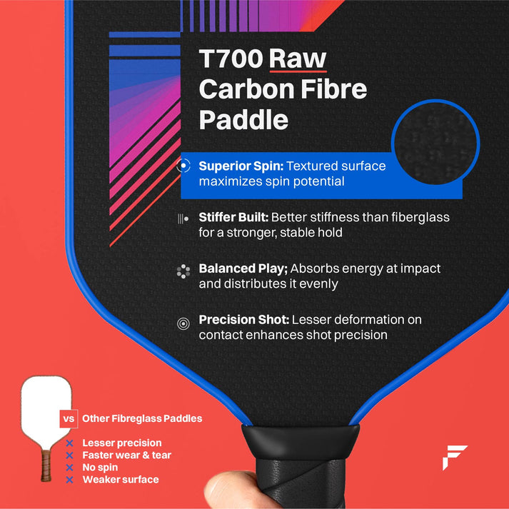 T700 RAW CARBON FIBRE: Advanced Carbon Friction Surface (CFS) combined with T700 RAW Carbon Fibre material, increases friction to maximise spin & ball control. CFS technology provides a more advanced, durable and longer lasting friction surface. Premium Carbon Fibre strengthens the paddle & provides a crisp feel with greater energy return.